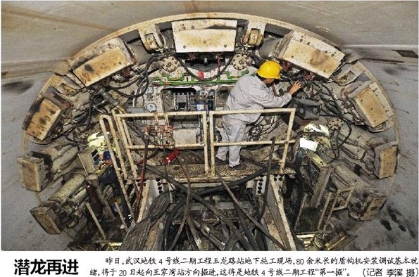 新聞圖片拍攝于鐘鑫公司玉龍路地鐵項目部地下施工現場,報道以“潛龍再進”題,把漢陽市政一號盾構機比作潛入地下的長龍,蓄勢待發,在即將開始的盾構掘進施工中大顯身手。報道在文中指出,盾構機調試工作基本就緒,將開始武漢地鐵4號線二期工程“第一掘”。