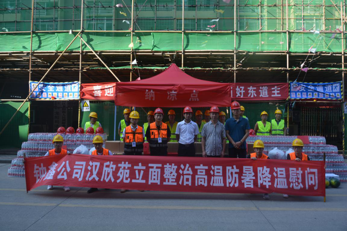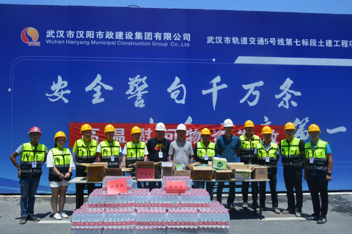 ? ? 酷暑來襲!近日,武漢頻頻發(fā)布高溫橙色預(yù)警,天氣炎熱干燥,公司領(lǐng)導(dǎo)十分牽掛一線作業(yè)人員的健康安全。為做好防暑降溫工作,加強(qiáng)高溫天氣下勞動(dòng)作業(yè)保護(hù),2019年7月26日上午,鐘鑫公司董事長曹元鑫、總經(jīng)理盧永紅、副總經(jīng)理徐浩以及工會(huì)主席肖艷霞一行來到月亮灣城市陽臺(tái)、5.7標(biāo)等項(xiàng)目部開展了高溫慰問活動(dòng),為他們送去了礦泉水、****、綠豆、酸梅膏以及藥品等防暑降溫用品,給一線員工送去了陣陣“清涼”。