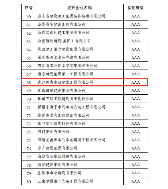 近日,中國施工企業管理協會發布了《關于公布2021年度第一批工程建設企業信用評價結果的通知》,鐘鑫公司首次獲評中施企協AAA信用等級企業!被評定為“經營狀況很好,信用記錄優秀,發展前景很廣闊,對履行相關經濟和社會責任能夠提供很強的安全保障,不確定因素對其經營和發展的影響最小”的企業。